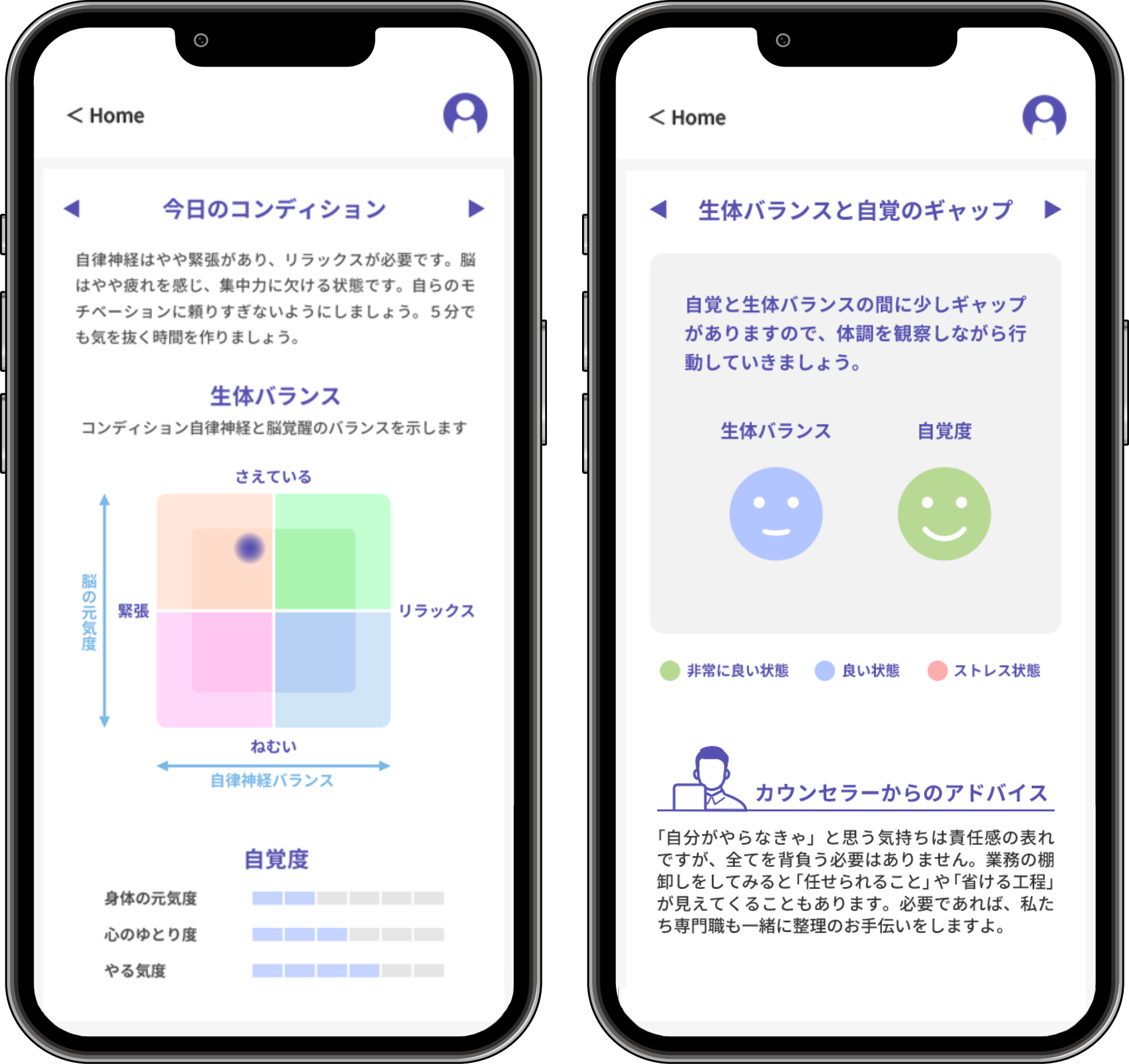 計測はわずか30秒。短い朗読と質問事項を入力するだけで脳疲労度、自律神経バランス、自覚とのギャップなどを高精度で分析します。